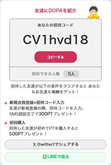 新規登録する際、招待コードを持っていると、DOPAで使えるポイントを貰う事ができます。