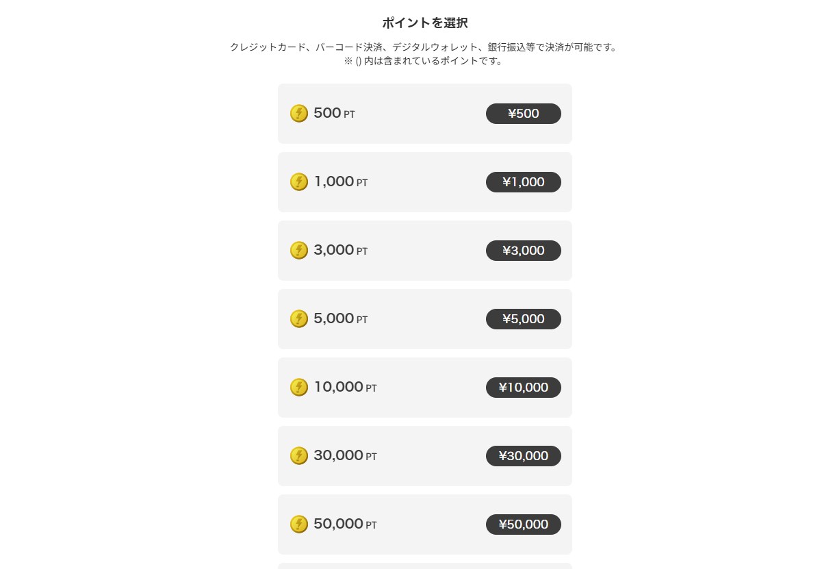 金額は1pt=1円で、500pt~1,000,000ptまで購入する事ができます。