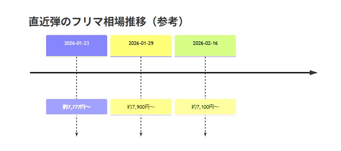 直近弾の例として、ムニキスゼロは発売日直後のフリマ相場が約7,777円付近で、数週間〜1か月で約7,100円のレンジへ下がったという集計がある。