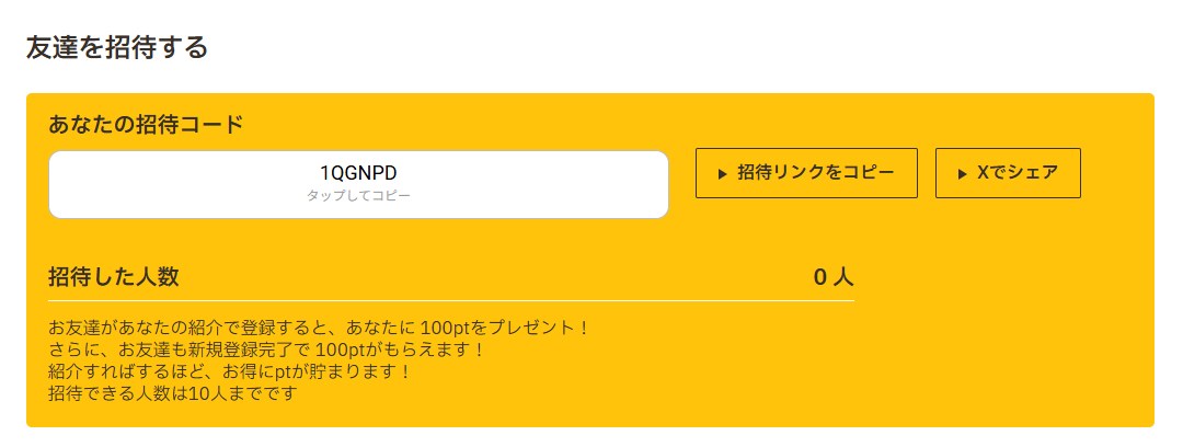 ② 登録後:自分専用の招待コードが発行されるので友達がそのコードで登録するとあなたに100ptずつ加算(最大10人まで)
